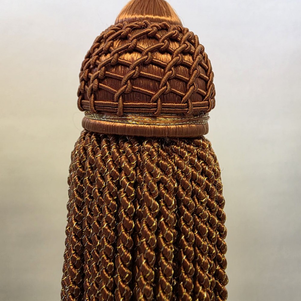 Виготовлена з високоякісних текстильних волокон, вона має щільне плетіння у верхній частині та розкішну багатошарову бахрому, що створює глибину фактури й благородний блиск. Сучасна інтерпретація класики з металізованими мерехтливими деталями надає стиль і вишуканість цієї маленької китиці.