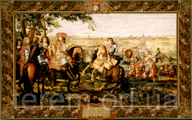 Один из серии в 14 гобеленов «История Короля» выткана по картонам Главного художника мануфактуры Гобеленов Ш. Лебрюн во второй половине 18 века. Серия возвеличивает короля Людовика 14 и украшает апартаменты Версальского дворца.