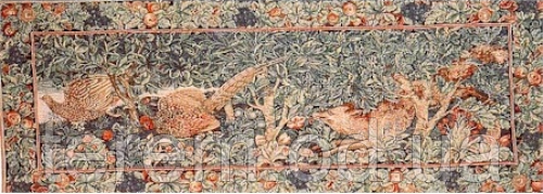 Это первый гобелен, сделанный по проекту Джона Дирла (1860-1932 г.г.), ставшего позже в фирме "Morris & Co" главным художником в отделении текстиля. Дирл и другие работали над гобеленом "Лис и фазаны" специально для Королевский юбилейной выставки, состоявшейся в Манчестере в 1887 году. Гобелен был окончательно завершен в 1888 году и впоследствии куплен для Whitworth Art Gallery в Манчестере, где находится и по сей день в добром здравии и великолепном состоянии.